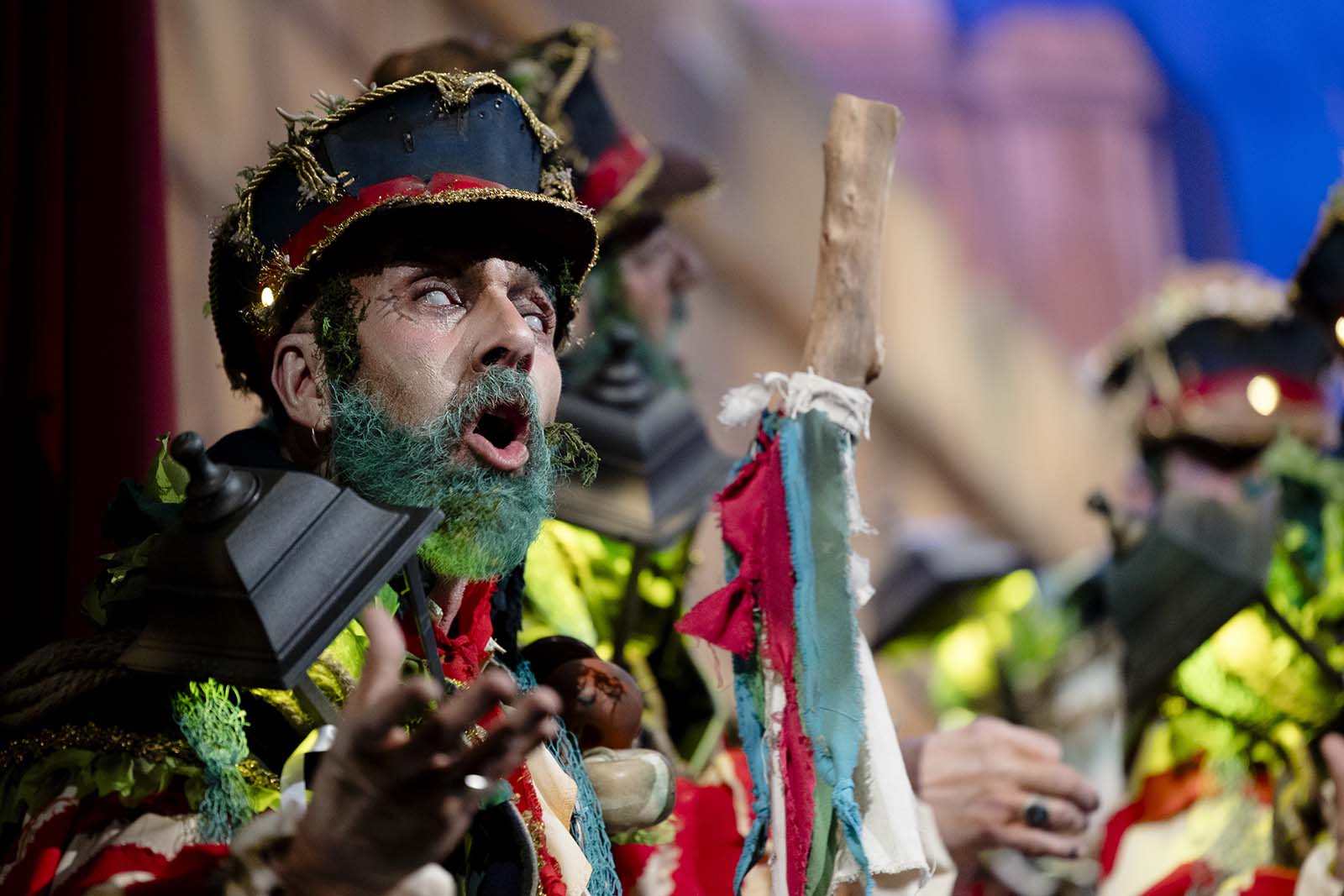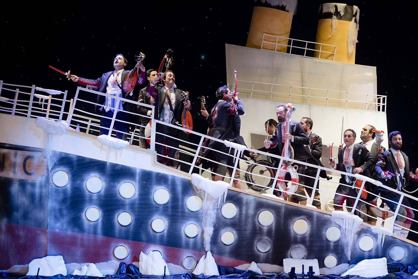 Impresionante puesta en escena para, de la mano de su banda, revivir los últimos instantes del hundimiento del celebre Titanic. La chirigota del Bizcocho se presentó a bordo de una lograda embarcación, que se ‘hundía’ poco a poco y que, con gran acierto, metió al público del Gran Teatro Falla en esa atmósfera trágica, de humor negro. Escenografía que se antoja un claro y brillante ejemplo de lo mucho y bueno que la labor artesanal puede aportar a las agrupaciones del carnaval, proyectando la temática elegida y captando toda la atención de los presentes.